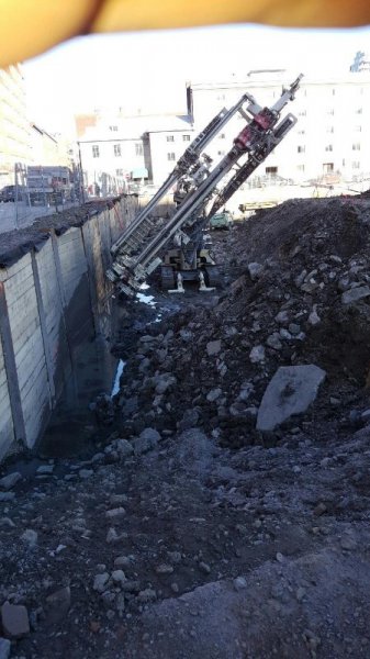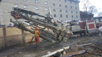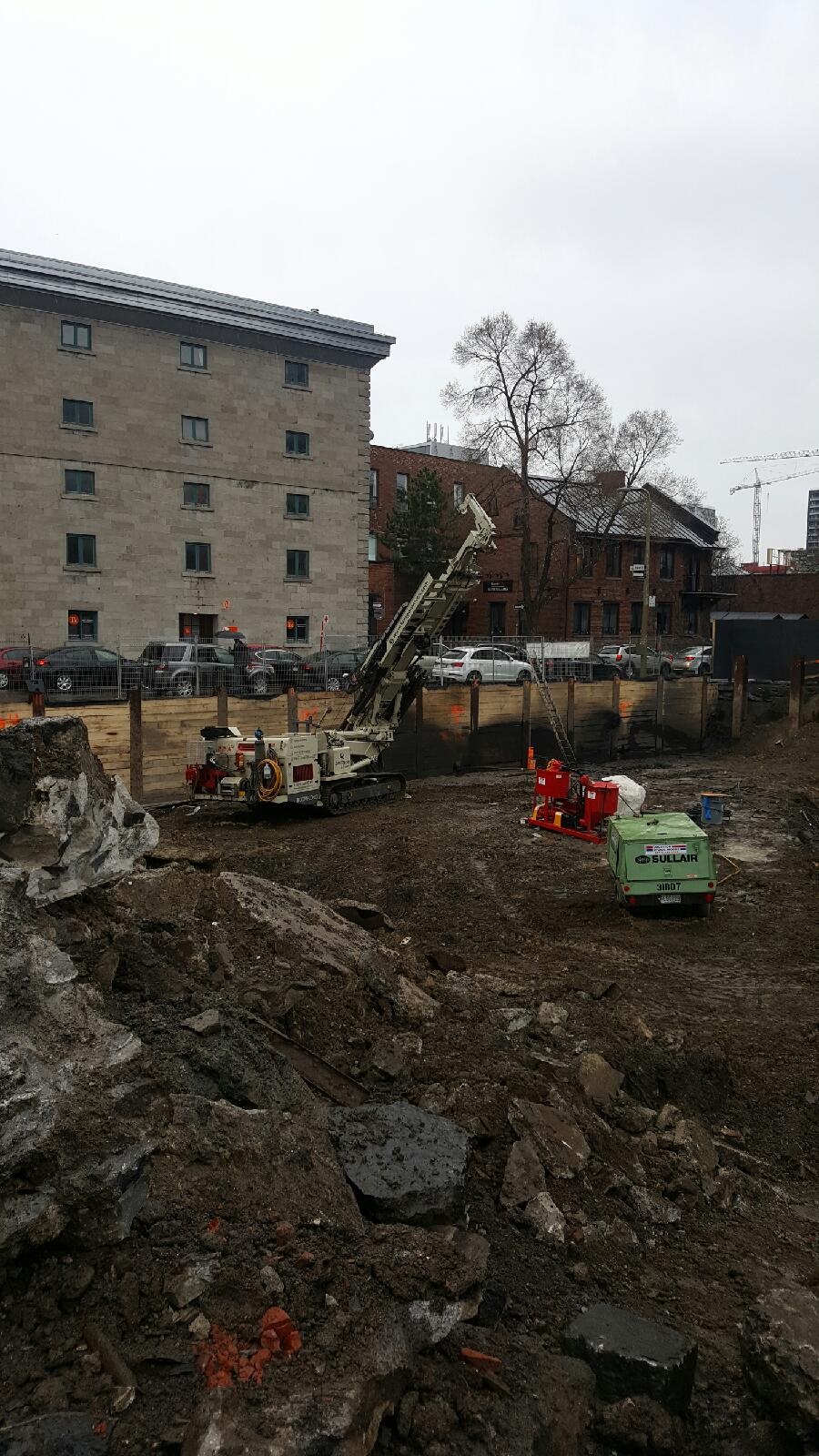Forage de 17 ancrages au roc d'une profondeur d'environ 105' pour le soutien d'un mur berlinois sur le projet du 21e Arrondissement à Montréal.
