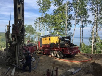 Forage d'un puits artésien pour une nouvelle résidence construite sur le Chemin du Domaine Charlevoix à Baie-Saint-Paul, Charlevoix. Une collerette de bentonite était nécessaire en raison de la proximité du roc. Une pompe submersible a par la suite été installée dans le puits afin d'alimenter la maison en eau.