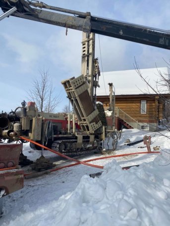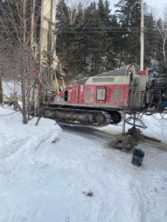 Forage d'un puits artésien pour une résidence située sur le Chemin Cap-aux-Corbeaux Sud à Baie-Saint-Paul dans la région de Charlevoix. Une collerette de bentonite a été aménagée en raison de la proximité du roc. Une pompe submersible a par la suite été installée dans le puits afin d'alimenter la maison en eau.