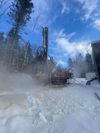 Forage d'un puits artésien pour une nouvelle maison située sur le Chemin du Domaine, dans le Domaine Charlevoix à Baie-St-Paul. Une pompe submersible a par la suite été installée dans le puits afin d'alimenter la maison en eau.