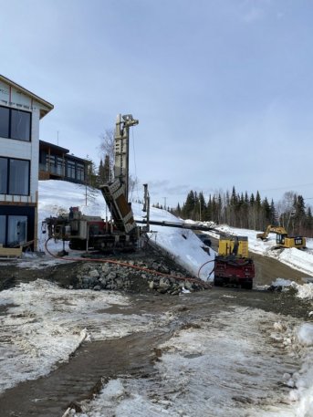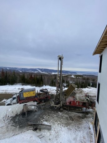 Forage d'un puits artésien pour une nouvelle résidence construite dans l'Horizon Boisé à Baie-Saint-Paul dans Charlevoix. Une collerette de bentonite était nécessaire en raison de la proximité du roc. Une pompe submersible a par la suite été installée dans le puits afin d'alimenter la maison en eau.