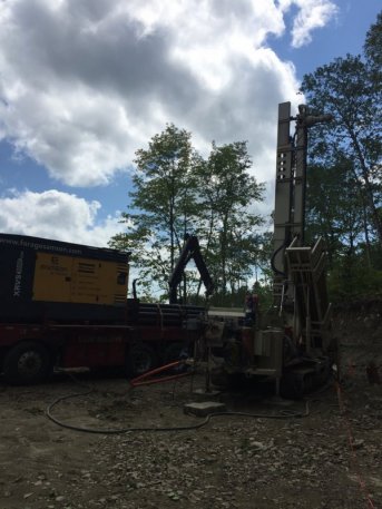 Forage d'un puits artésien pour une nouvelle résidence située sur le Chemin du Domaine dans le Domaine Charlevoix à Baie-Saint-Paul. Une collerette de bentonite était nécessaire en raison de la proximité du roc. Une pompe submersible a par la suite été installée dans le puits afin d'alimenter la maison en eau.
