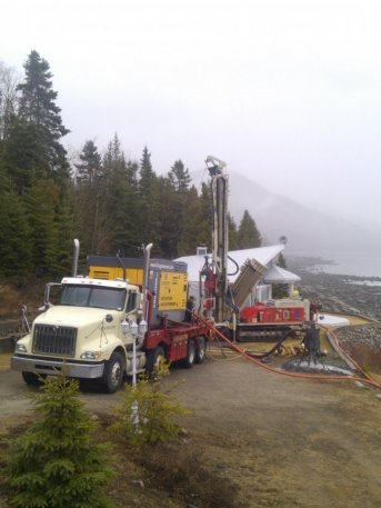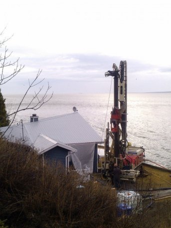 Forage d'un puits artésien avec collerette pour une résidence de Saint-Siméon, Charlevoix. Une pompe submersible a par la suite été installée dans le puits artésien afin d'alimenter la résidence en eau potable.