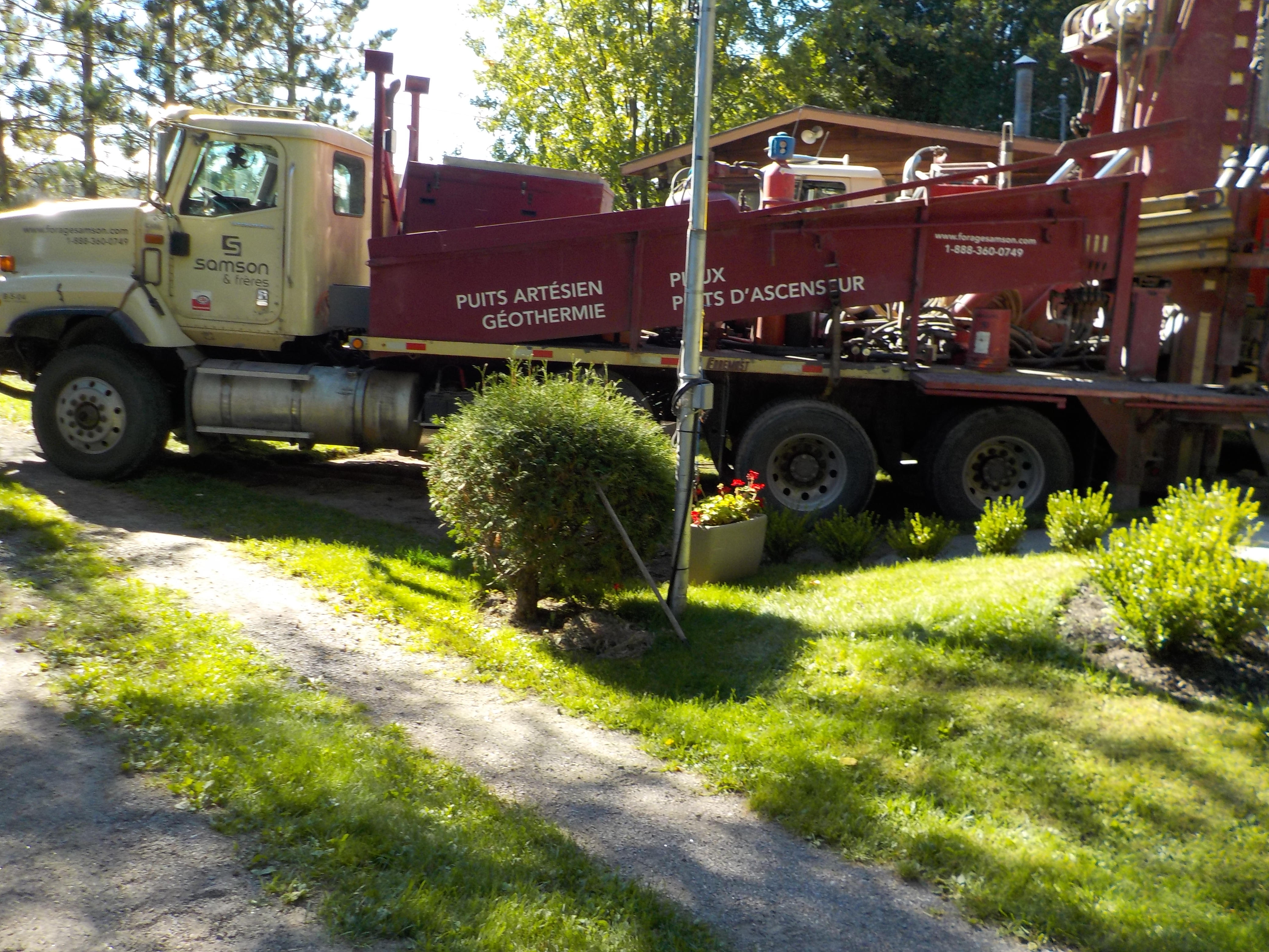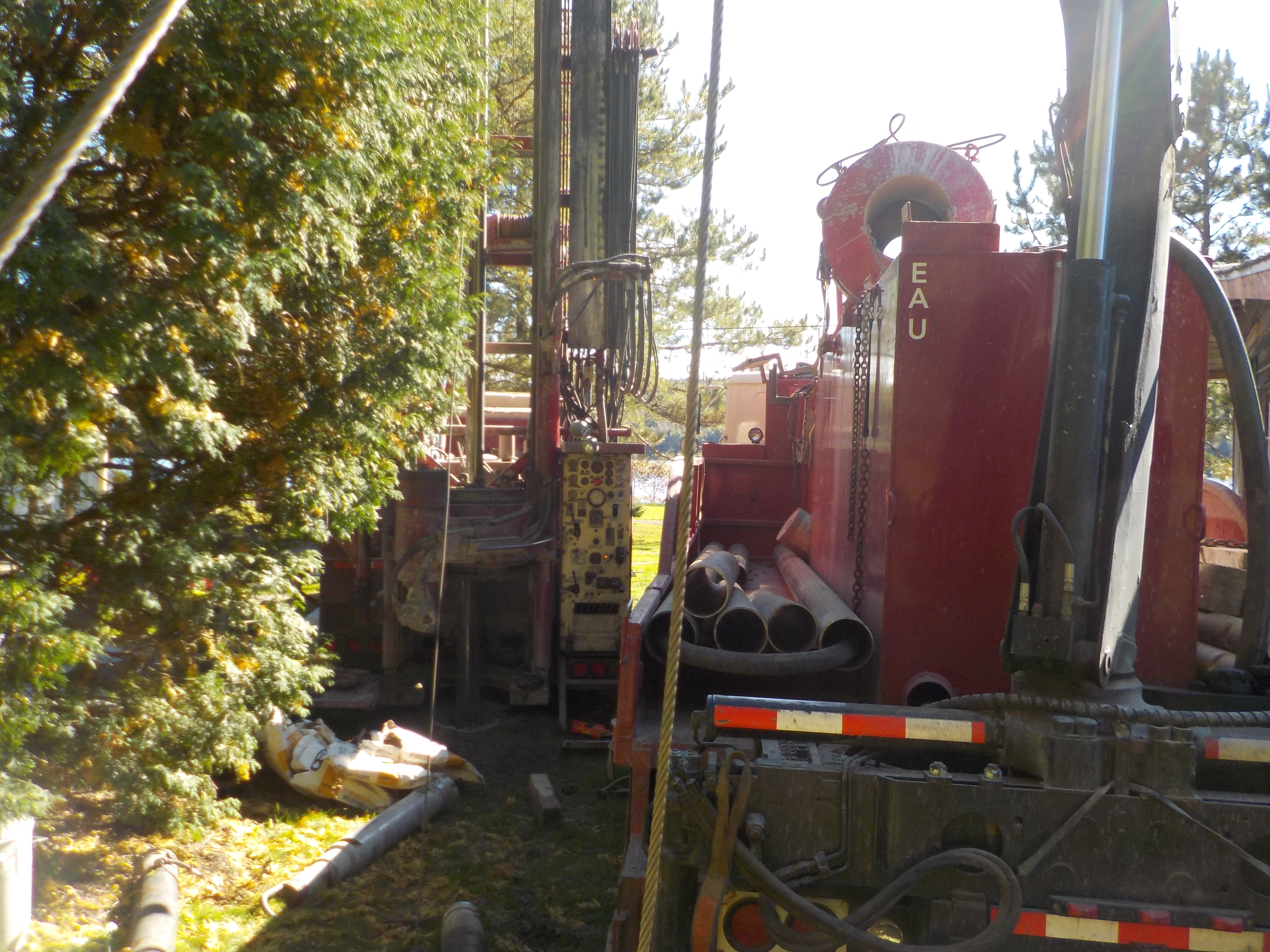 Forage d'un puits artésien pour une résidence située sur le Chemin des Terres-Rompues à Chicoutimi-Nord, Saguenay. Une collerette de bentonite était nécessaire afin de respecter les normes du MDDELCC. Une pompe submersible en acier inoxydable a par la suite été installée dans le puits artésien afin d'alimenter la maison en eau potable.