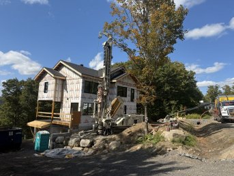 Forage d'un puits artésien et un puits géothermique de 560' pour une nouvelle résidence construite sur le Chemin du Grand-Duc au Lac-Beauport. Une collerette de bentonite était nécessaire en raison de la proximité du roc. Le client a également opté pour une pompe à pression constante.