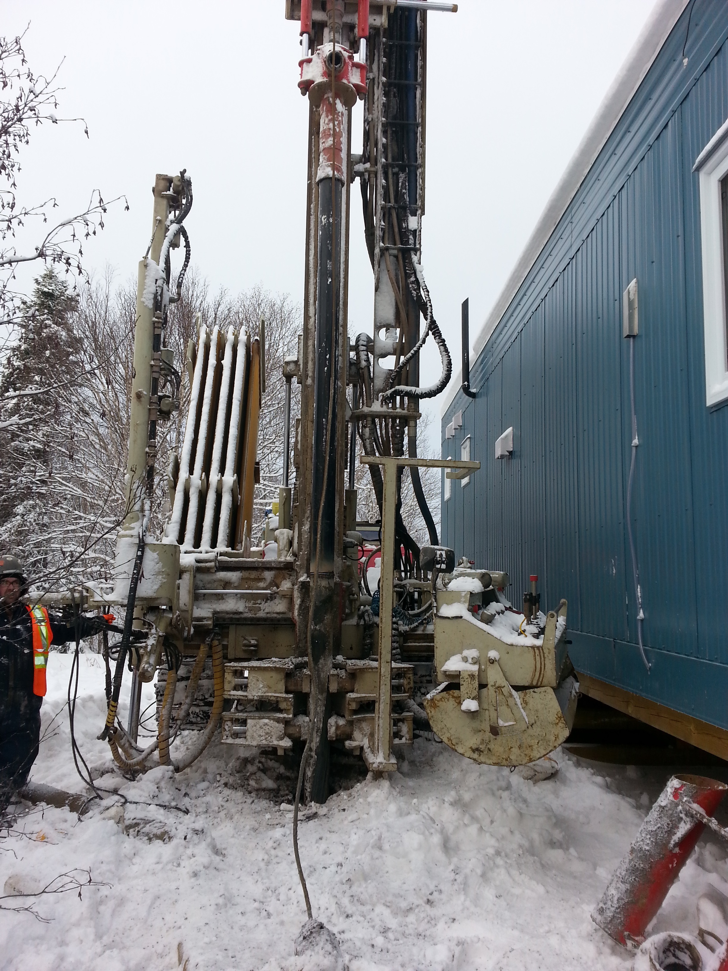 L'emplacement du site de forage obligeait l'utilisation d'une foreuse sur chenilles. Celle-ci devait être transportée par train et débarquée à l'aide d'une grue. L'équipe de forage voyageait matin et soir avec le train. Une couche de neige de plus de 2' recouvrait le sol lors des travaux, ce qui compliquait les déplacements.