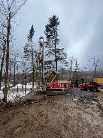 Forage d'un puits artésien pour une nouvelle résidence située sur le Chemin du Grand-Duc au Lac-Beauport. Une collerette de bentonite était nécessaire en raison de la proximité du roc. Une pompe submersible a par la suite été installée dans le puits pour alimenter la maison en eau.