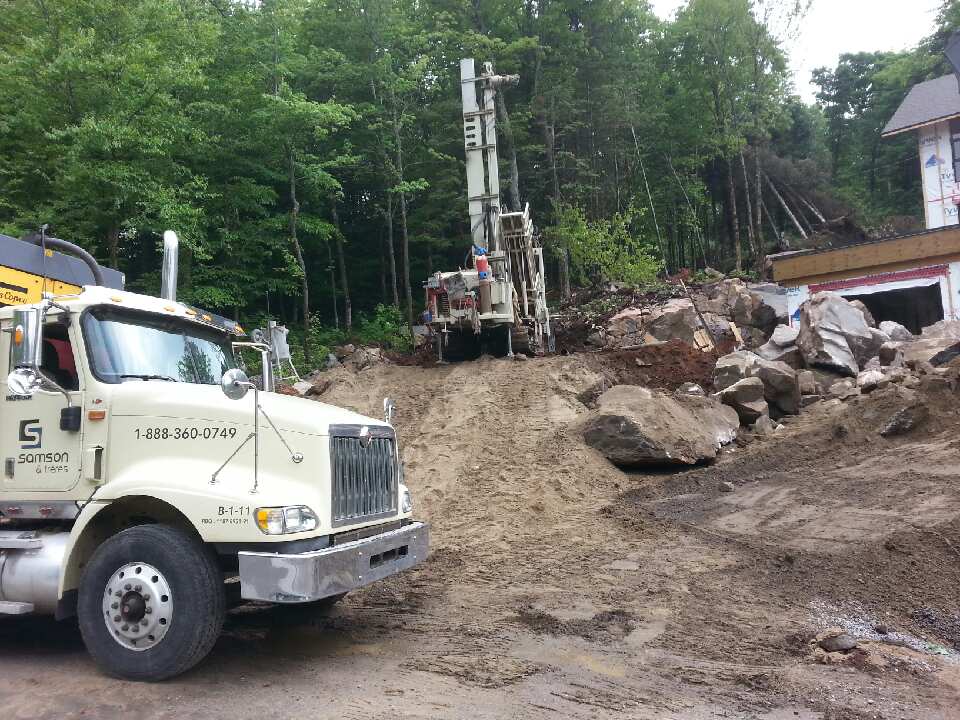 Forage d'un puits artésien pour une nouvelle résidence située sur le chemin du Grand-Duc au Lac-Beauport. Une collerette de bentonite (puits scellé) était nécessaire en raison de la proximité du roc. Une pompe submersible en acier inoxydable a par la suite été installée dans le puits artésien afin d'alimenter la résidence en eau potable.