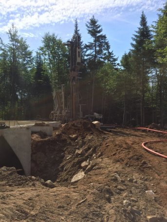 Forage d'un puits artésien pour une nouvelle résidence située sur le Chemin des Brumes au Lac-Beauport. une collerette de bentonite était nécessaire en raison de la proximité du roc. Une pompe submersible en acier inoxydable a par la suite été installée dans le puits afin d'alimenter la maison en eau.