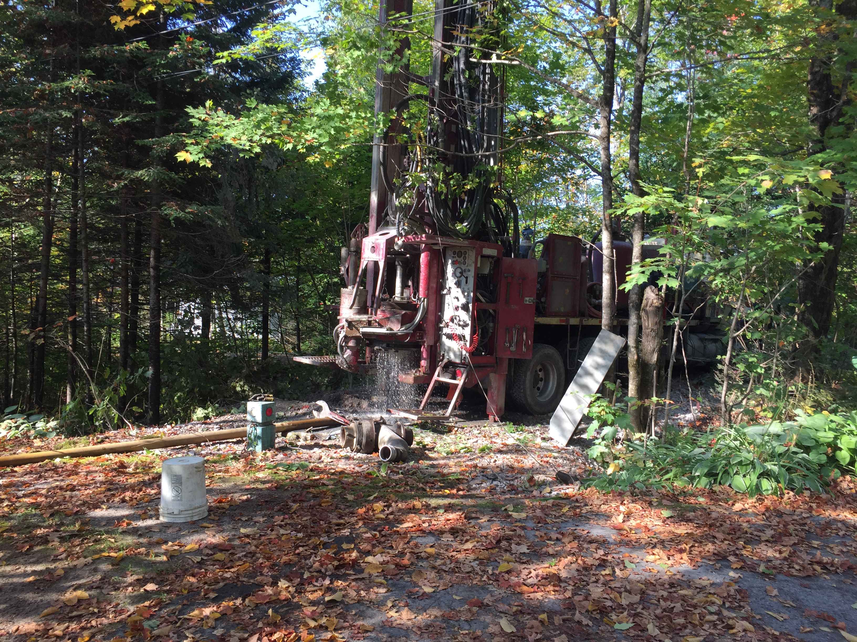 Forage d'un puits artésien pour une résidence située en bordure du Lac-Sept-Iles à Saint-Raymond de Portneuf. Une collerette de bentonite était nécessaire en raison de la proximité du roc. Nous avons par la suite installée une pompe submersible.