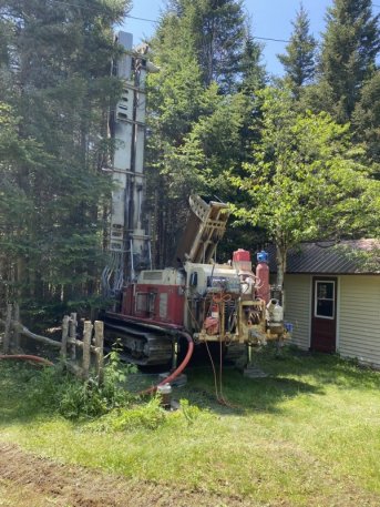 Forage d'un puits artésien pour une résidence située en bordure du Lac-Trois-Saumons à Saint-Aubert. Une collerette de bentonite était nécessaire en raison de la proximité du roc. Une pompe submersible a par la suite été installée dans le puits aifn d'alimenter la maison en eau.