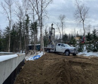 Forage d'un puits artésien pour une nouvelle résidence située sur le Chemin de la Corniche aux Éboulements dans le Domaine Charlevoix. Une pompe submersible a par la suite été installée dans le puits afin d'alimenter la maison en eau.