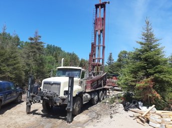 Forage d'un puits artésien pour une nouvelle résidence construite sur le Chemin Saint-Laurent aux Escoumins dans la Haute-Côte-Nord. Une collerette de bentonite était nécessaire en raison de la proximité du roc.