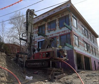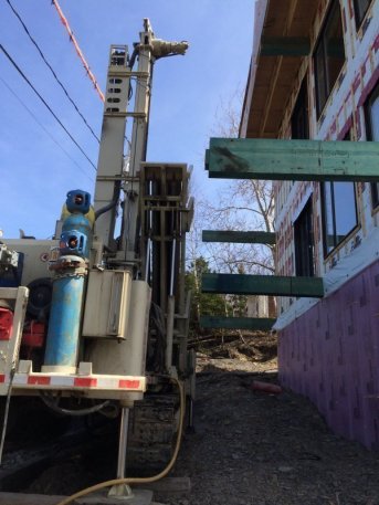 Forage d'un puits artésien avec collerette de bentonite pour une nouvelle résidence de Lévis. Le client a opté pour un système de pompage à débit variable / pression constante.