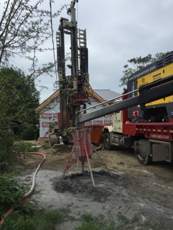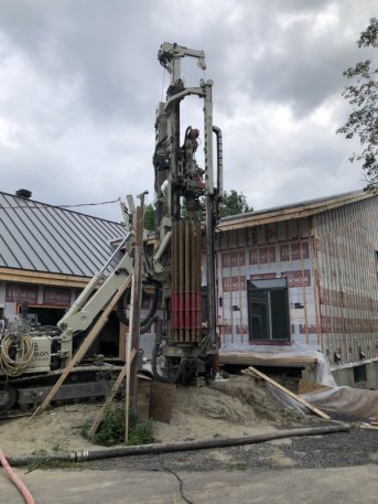 Forage d'un puits artésien et un puits géothermique pour une nouvelle résidence située sur la rue des Chenaux à Lévis. Une collerette de bentonite a du être aménagée en raison de la proximité du roc. Une pompe submersible a par la suite été installée dans le puits afin d'alimenter la maison en eau.