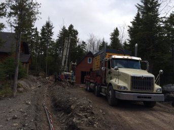 Forage d'un puits artésien avec collerette de bentonite pour une nouvelle résidence de Montmagny. Une pompe submersible en acier inoxydable a par la suite été installée dans le puits artésien afin d'alimenter la résidence en eau potable.