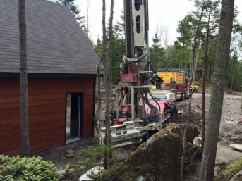 L'espace très restreint rendait difficile de réaliser le puits artésien en respectant les normes. La petite dimension de la foreuse sur chenilles nous permettait de localiser le puits artésien à l'emplacement désiré par le client, tout en respectant les normes du MDDEFP.