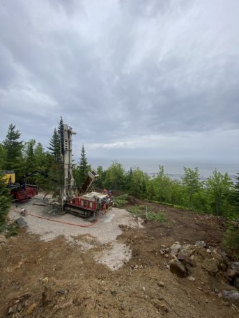 Forage d'un puits artésien pour une nouvelle résidence située sur le Chemin du Versant à Petite-Rivière-Saint-François dans la région de Charlevoix. Une collerette de bentonite était nécessaire en raison de la proximité du roc. Une pompe submersible a par la suite été installée dans le puits afin d'alimenter la maison en eau.