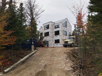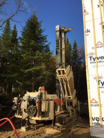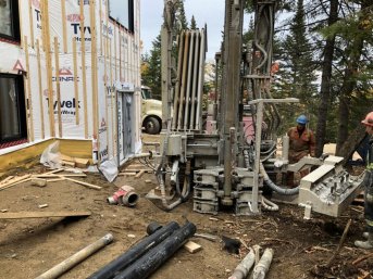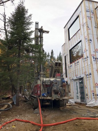 Forage d'un puits artésien pour une nouvelle résidence située sur le Chemin de la Rose-Hélène à Petite-Rivière-Saint-François, Charlevoix. Une collerette de bentonite était nécessaire en raison de la proximité du roc. Une pompe submersible a par la suite été installée afin d'alimenter en eau la maison située dans le Fief du Massif.