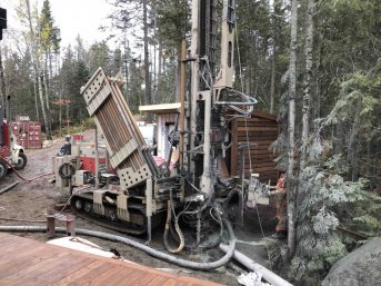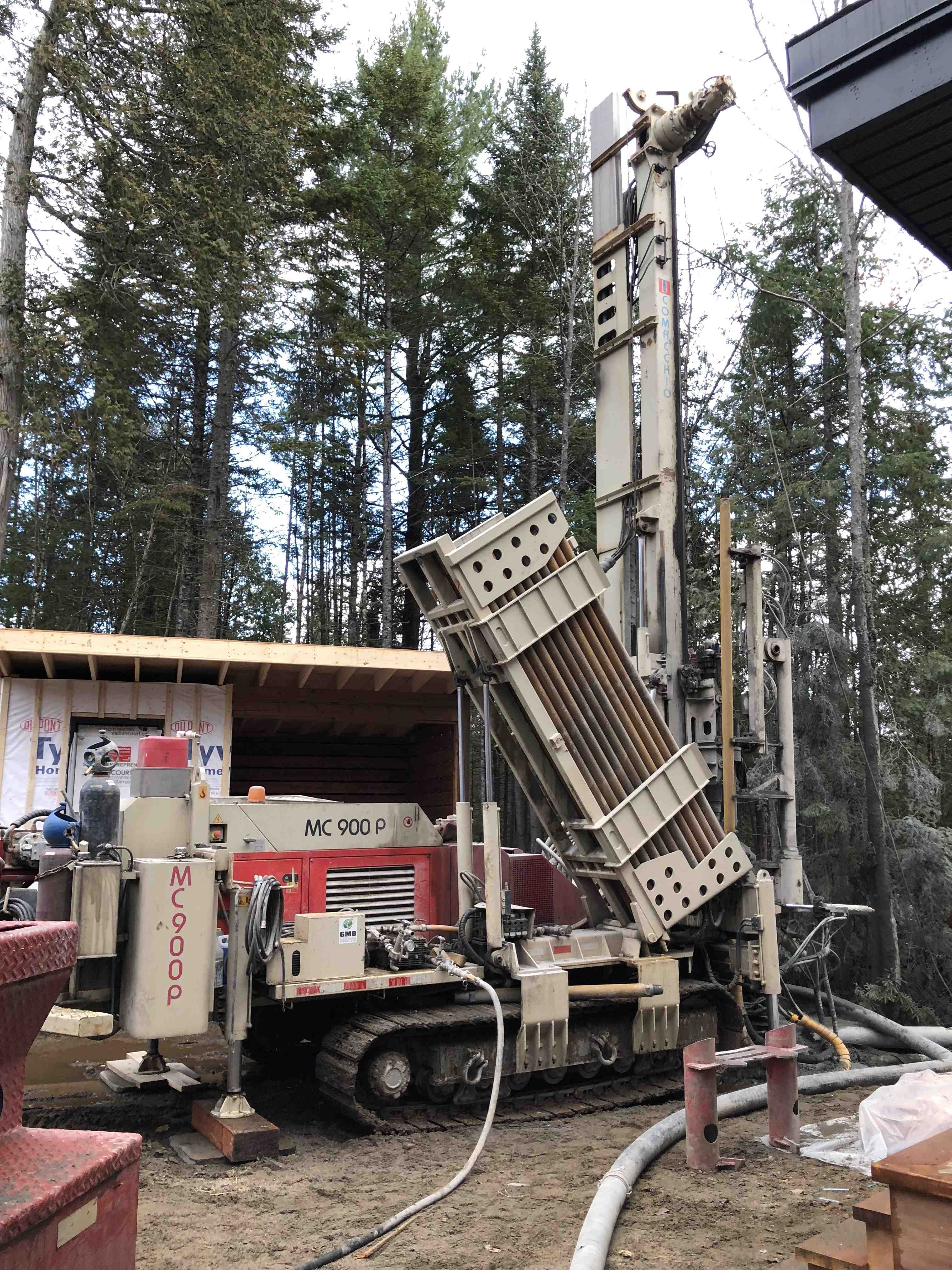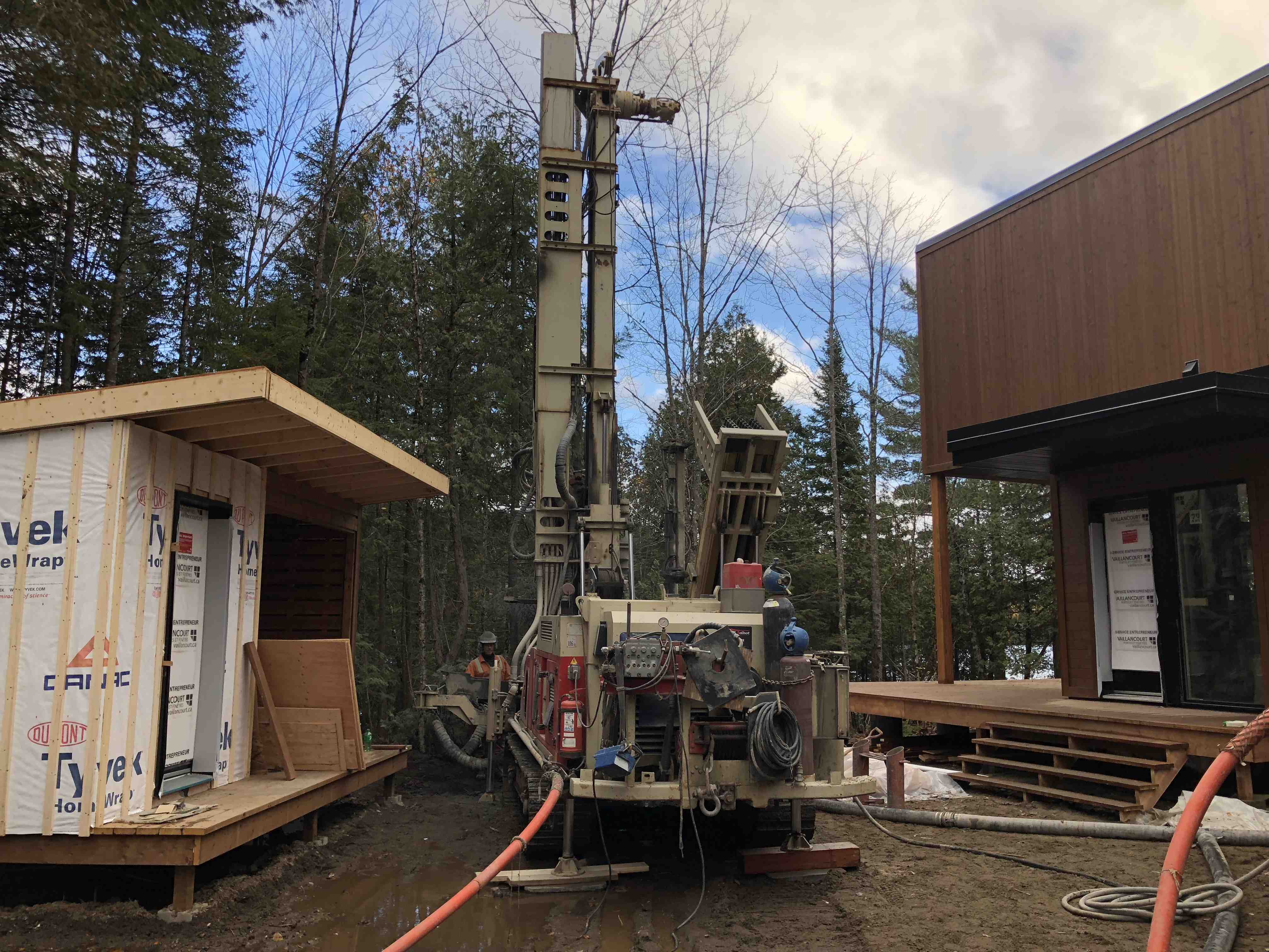 Forage d'un puits artésien pour une nouvelle résidence située en bordure du Gros Lac dans le Bourg de la Seigneurie de Perthuis dans le développement de Solifor à Rivière-à-Pierre. Une collerette de bentonite était nécessaire en raison de la proximité du roc.