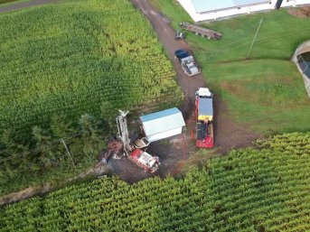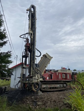 Forage d'un puits artésien de 8 pouces pour une ferme porcine située sur le Chemin de l'Hétrière à Saint-Charles de Bellechasse. Une pompe submersible a par la suite été installée dans le puits artésien afin d'alimenter le bâtiment en eau.