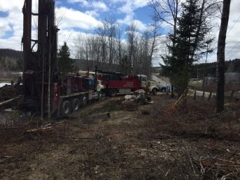 Forage d'un puits artésien pour une nouvelle résidence située sur le rang Pointe-Lévis à Saint-Damien-de-Buckland. Une pompe submersible a par la suite été installée dans le puits artésien afin d'alimenter la maison en eau.