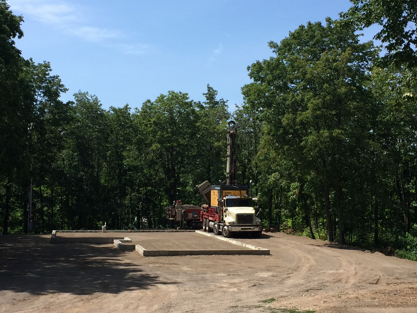 Forage d'un puits artésien pour une nouvelle résidence située sur le Chemin Lamartine Ouest à Saint-Eugène, L'Islet. Une collerette de bentonite était nécessaire en raison de la proximité du roc. Une pompe submersible en acier inoxydable a par la suite été installée dans le puits artésien afin d'alimenter la maison en eau.