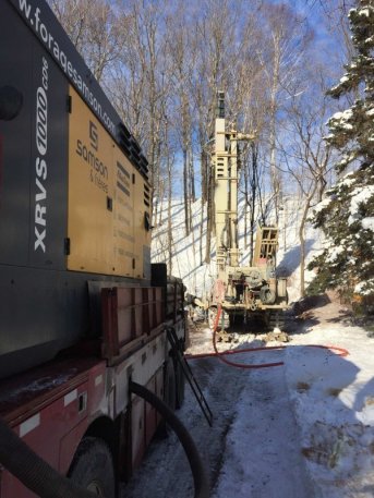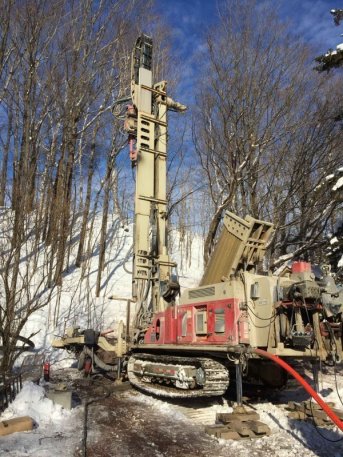 Forage d'un puits artésien pour une résidence située sur le Chemin Royal à Saint-Jean-de-l'Île-d'Orléans. Une collerette de bentonite était nécessaire en raison de la proximité du roc. Une pompe submersible en acier inoxydable a par la suite été installée dans le puits artésien afin d'alimenter la maison en eau.