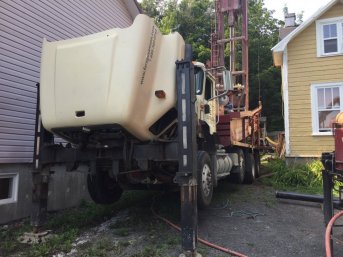 Forage d'un puits artésien pour une résidence située sur le Chemin Royal à Saint-Jean de l'Ile-d'Orléans. Une collerette de bentonite était nécessaire en raison de la proximité du roc. Une pompe submersible a par la suite été installée dans le puits afin d'alimenter la maison en eau.