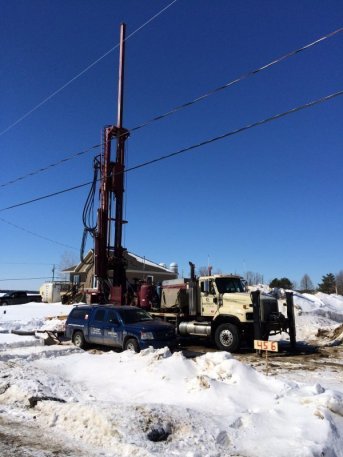 Forage d'un puits artésien pour une nouvelle résidence de St-Lambert-de-Lauzon. Une pompe submersible en acier inoxydable a par la suite été installée dans le puits artésien.