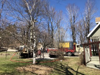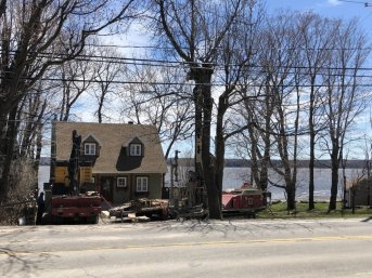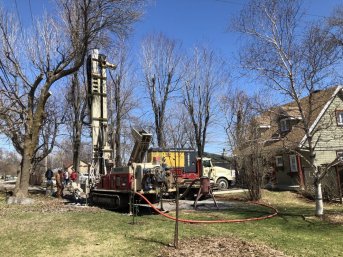 Forage d'un puits artésien pour une résidence située sur le Chemin Royal à Saint-Laurent, Île-d'Orléans. Une collerette de bentonite était nécessaire en raison de la proximité du roc.