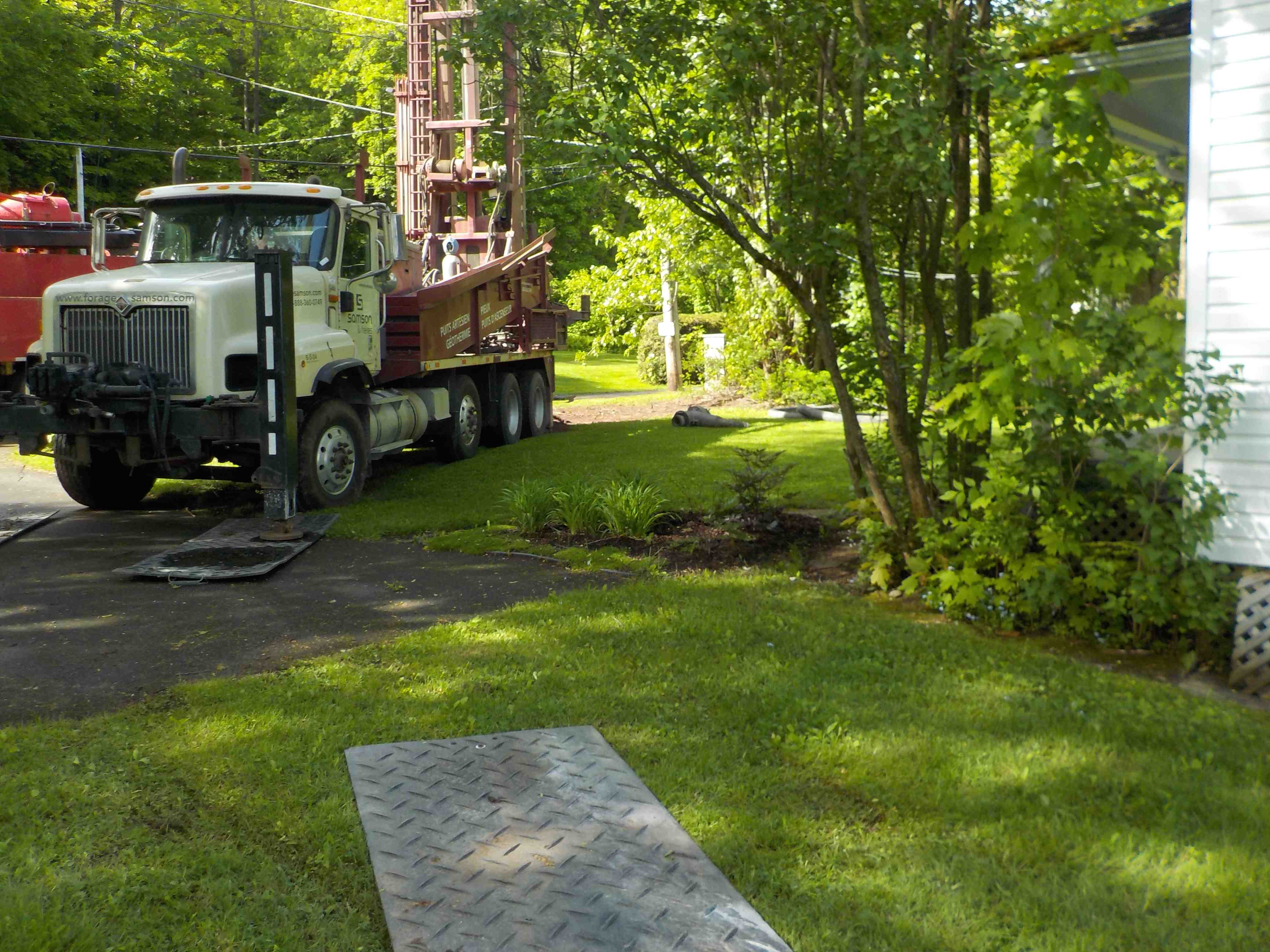 Forage d'un puits artésien pour une résidence située en bordure du Fleuve Saint-Laurent à Saint-Nicolas, Lévis. Une collerette de bentonite était nécessaire en raison de la proximité du roc. De plus, une pompe submersible en acier inoxydable a été installée dans le puits artésien afin d'alimenter la résidence en eau potable.