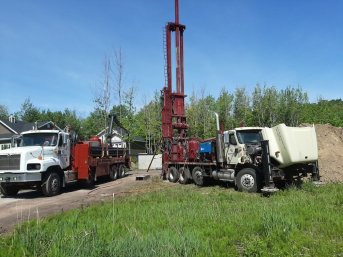 Forage d'un puits artésien pour une nouvelle résidence située sur la route des Rivières à Saint-Nicolas-Lévis. Une pompe submersible a par la suite été installée dans le puits afin d'alimenter la maison en eau.