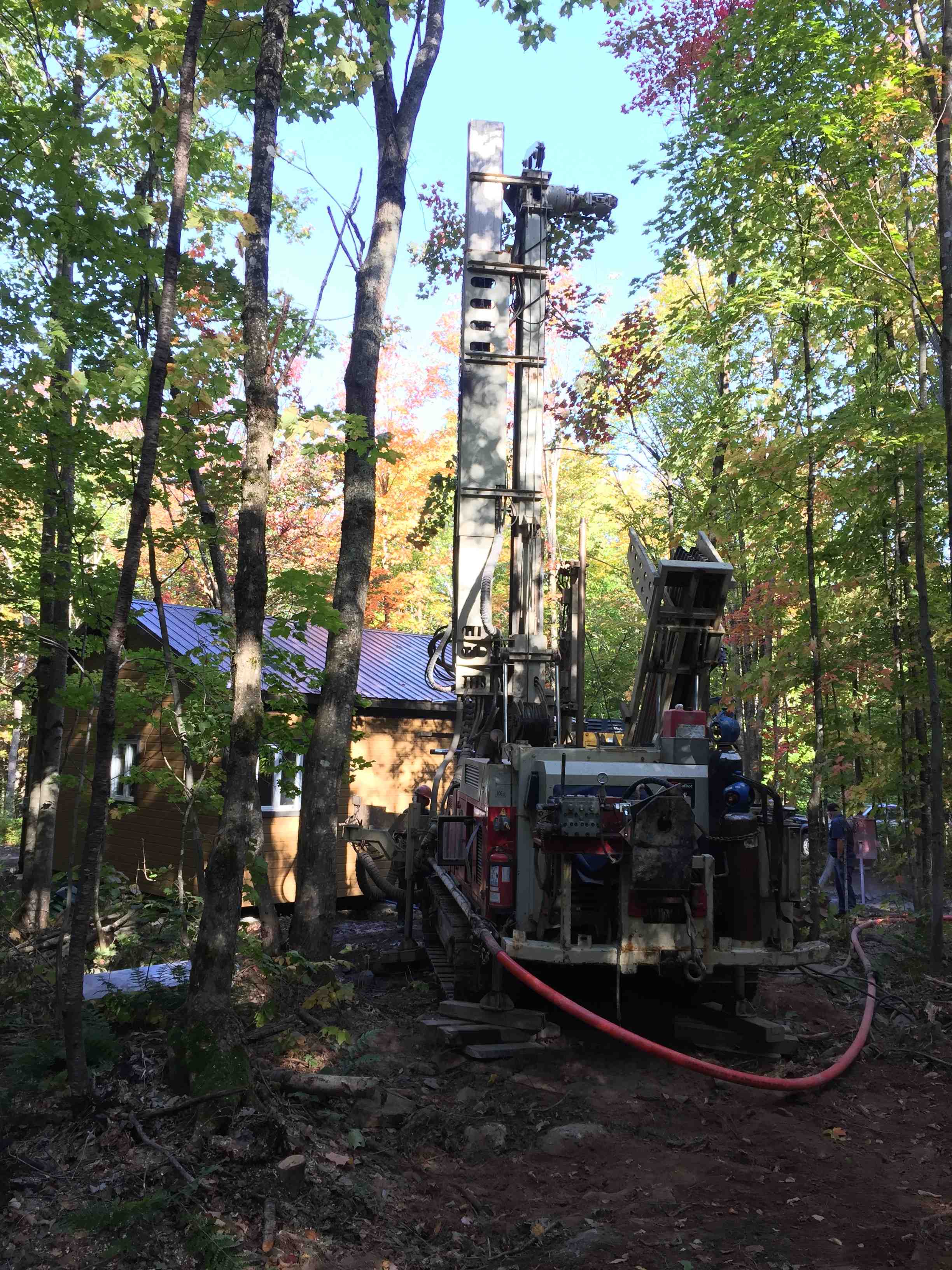 Forage d'un puits artésien pour une résidence de Saint-Pierre-de-la-Rivière-du-Sud. Une collerette de bentonite était nécessaire afin de respecter les normes du MDDELCC. Une pompe submersible a par la suite été installée dans le puits artésien afin d'alimenter la résidence en eau.