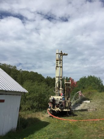 Forage d'un puits artésien pour une résidence située sur le Chemin Port-au-Persil à Saint-Siméon, Charlevoix. Une pompe submersible a par la suite été installée dans le puits artésien afin d'alimenter la maison en eau.