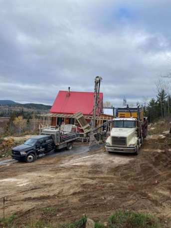 Forage d'un puits artésien pour une résidence située sur la rue Elzéar à Saint-Siméon dans la région de Charlevoix. Une collerette de bentonite était nécessaire en raison de la proximité du roc. Une pompe submersible en acier inoxydable a par la suite été installée dans le puits.