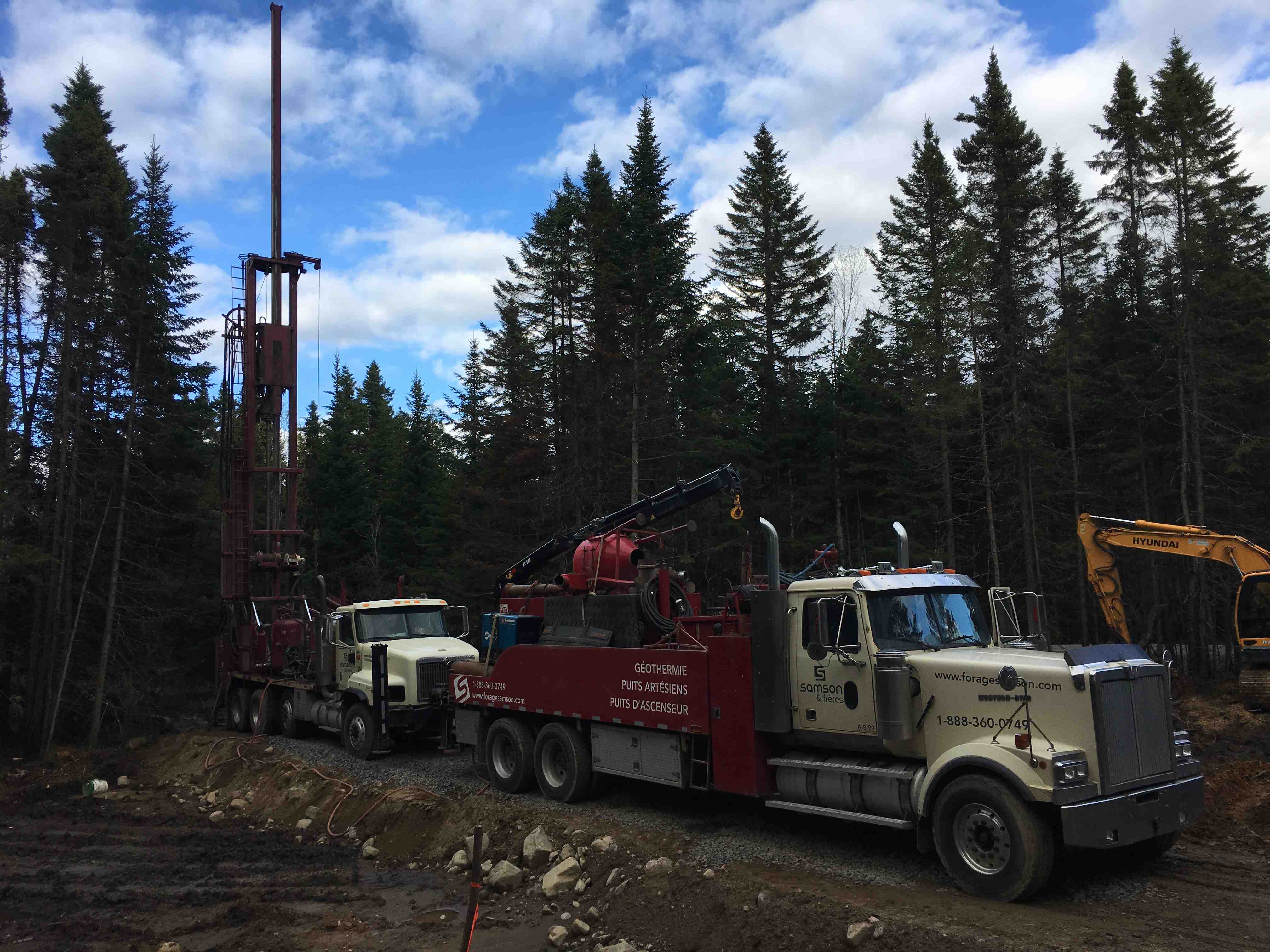 Forage d'un puits artésien pour une nouvelle résidence située dans le Chemin du Curé à Saint-Tite-des-Caps. Une pompe submersible a par la suite été installée dans le puits artésien afin d'alimenter la résidence en eau potable.
