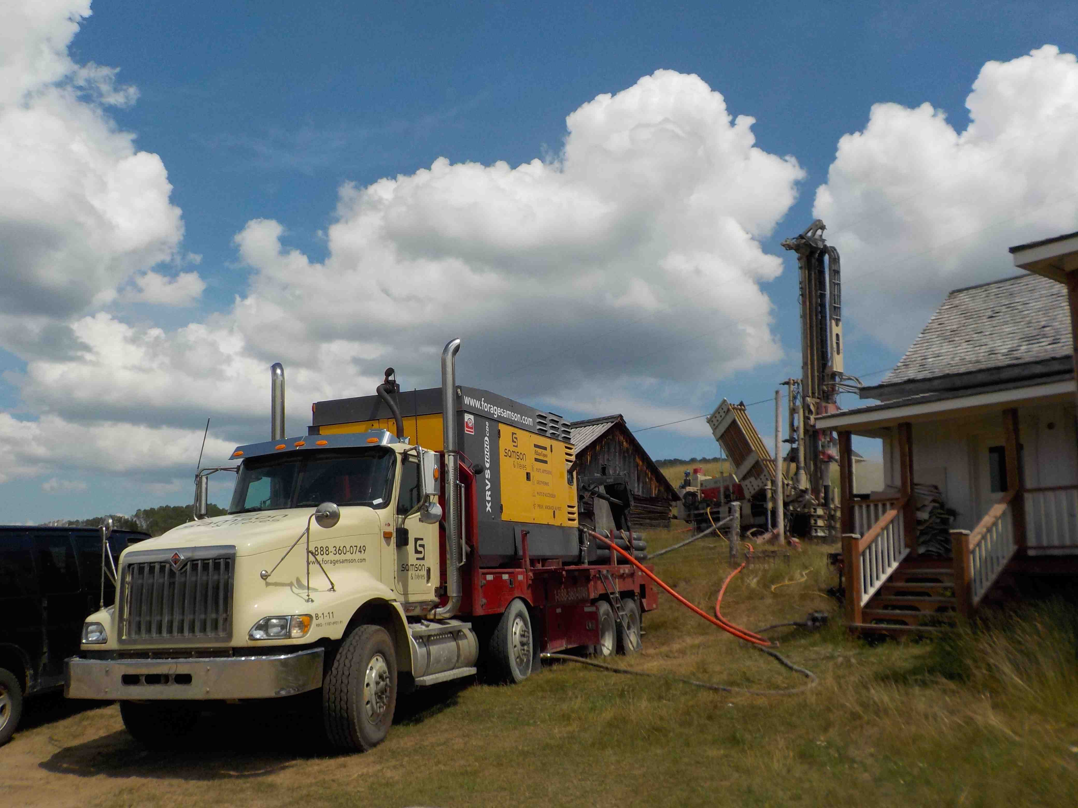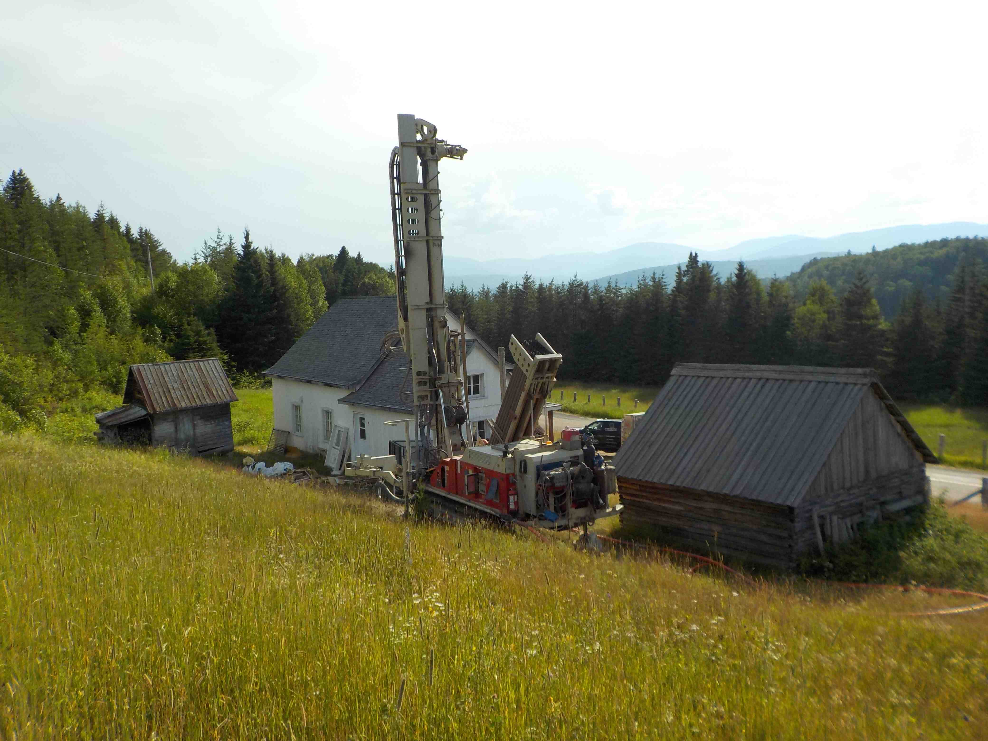 Forage d'un puits artésien pour une résidence située dans le rang Saint-Jean-Baptiste à Saint-Urbain, Charlevoix. Une pompe submersible en acier inoxydable a par la suite été installée dans le puits artésien afin d'alimenter la résidence en eau potable.