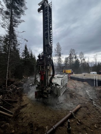 Forage d'un puits artésien pour une nouvelle résidence de la rue du Calvaire à Sainte-Brigitte-de-Laval. Une collerette de bentonite était nécessaire en raison de la proximité du roc. Une pompe submersible a par la suite été installée dans le puits.