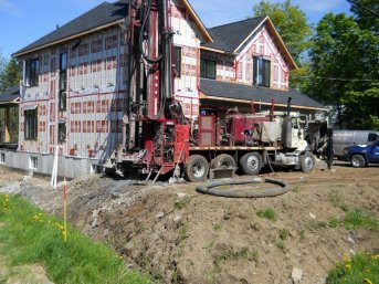 Forage d'un puits artésien pour une nouvelle résidence de Ste-Catherine-de-la-Jacques-Cartier. Une pompe submersible a par la suite été installée dans le puits artésien afin d'alimenter la maison en eau.