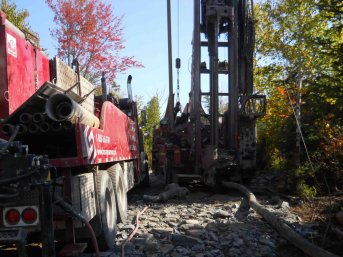 Forage d'un puits artésien pour un chalet de Sainte-Cécile-de-Whitton en Estrie. Une collerette de bentonite était nécessaire en raison de la proximité du roc.