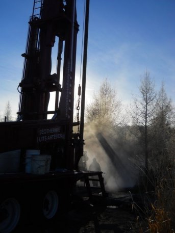 Forage d'un puits artésien pour une résidence de St-Fulgence au Saguenay-Lac-St-Jean. Un système de pompage en acier inoxydable a par la suite été installée dans le puits artésien.