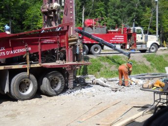 Forage d'un puits artésien pour une nouvelle résidence de la rue des Bolets à Stoneham. Le puits artésien de cette résidence de Aube 260 devait être scellé en raison de la proximité du roc. Une pompe submersible a par la suite été installée dans le puits artésien afin d'alimenter la maison en eau.