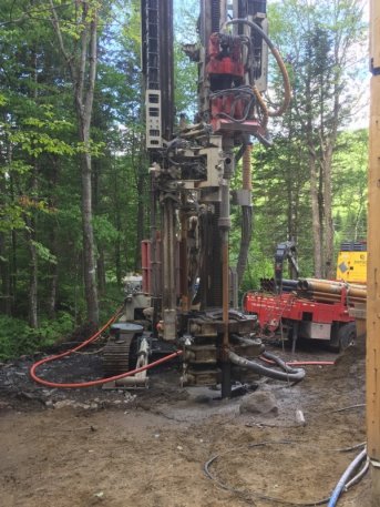 Forage d'un puits artésien pour une nouvelle résidence construite sur l'avenue Tewkesbury à Stoneham. Une collerette de bentonite était nécessaire en raison de la profondeur du roc. Une pompe submersible a par la suite été installée dans le puits afin d'alimenter la maison en eau.