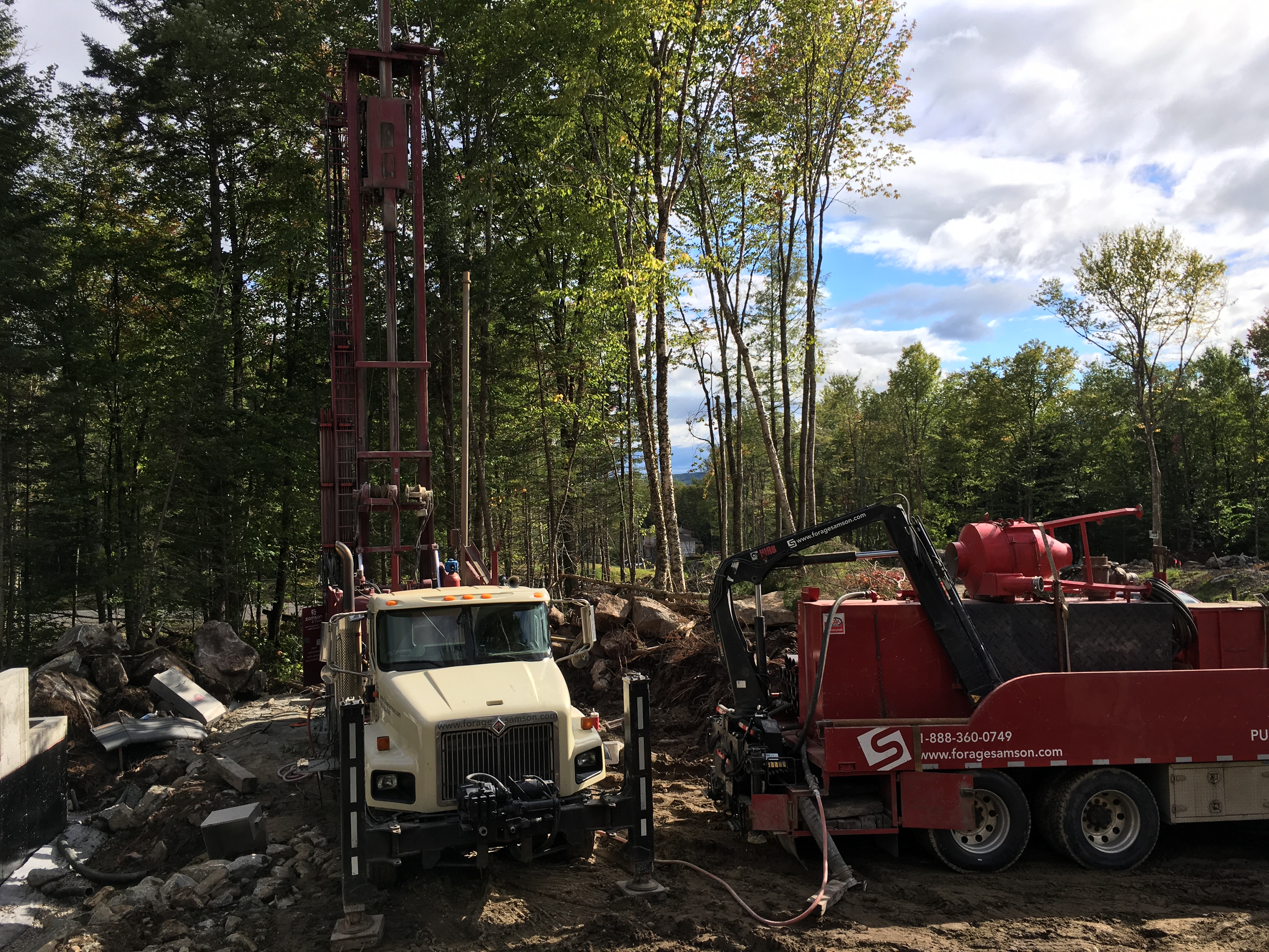 Forage d'un puits artésien pour une nouvelle résidence située sur le Chemin des Coprins dans le développement résidentiel Aube 260 à Stoneham. Une collerette de bentonite devait être aménagée en raison de la proximité du roc. Une pompe submersible en acier inoxydable a par la suite été installée dans le puits artésien afin d'alimenter cette maison en eau potable.